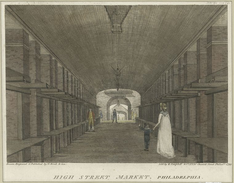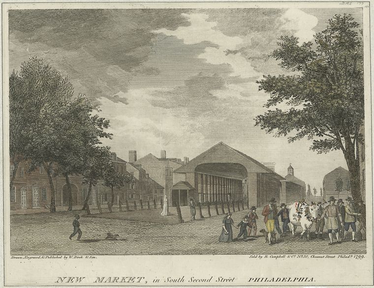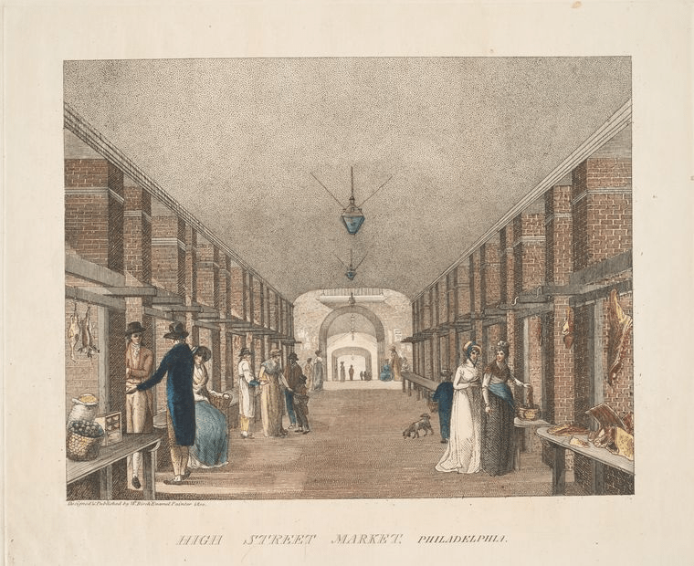 En el siglo XVIII, esta calle era el corazón económico y social de Filadelfia. Aquí se encontraba el mercado central, un espacio techado con columnas y tejado a dos aguas —una estructura abierta pero cubierta, con techo inclinado sostenido por columnas— donde los ciudadanos se reunían tres veces por semana para comprar alimentos y productos esenciales.